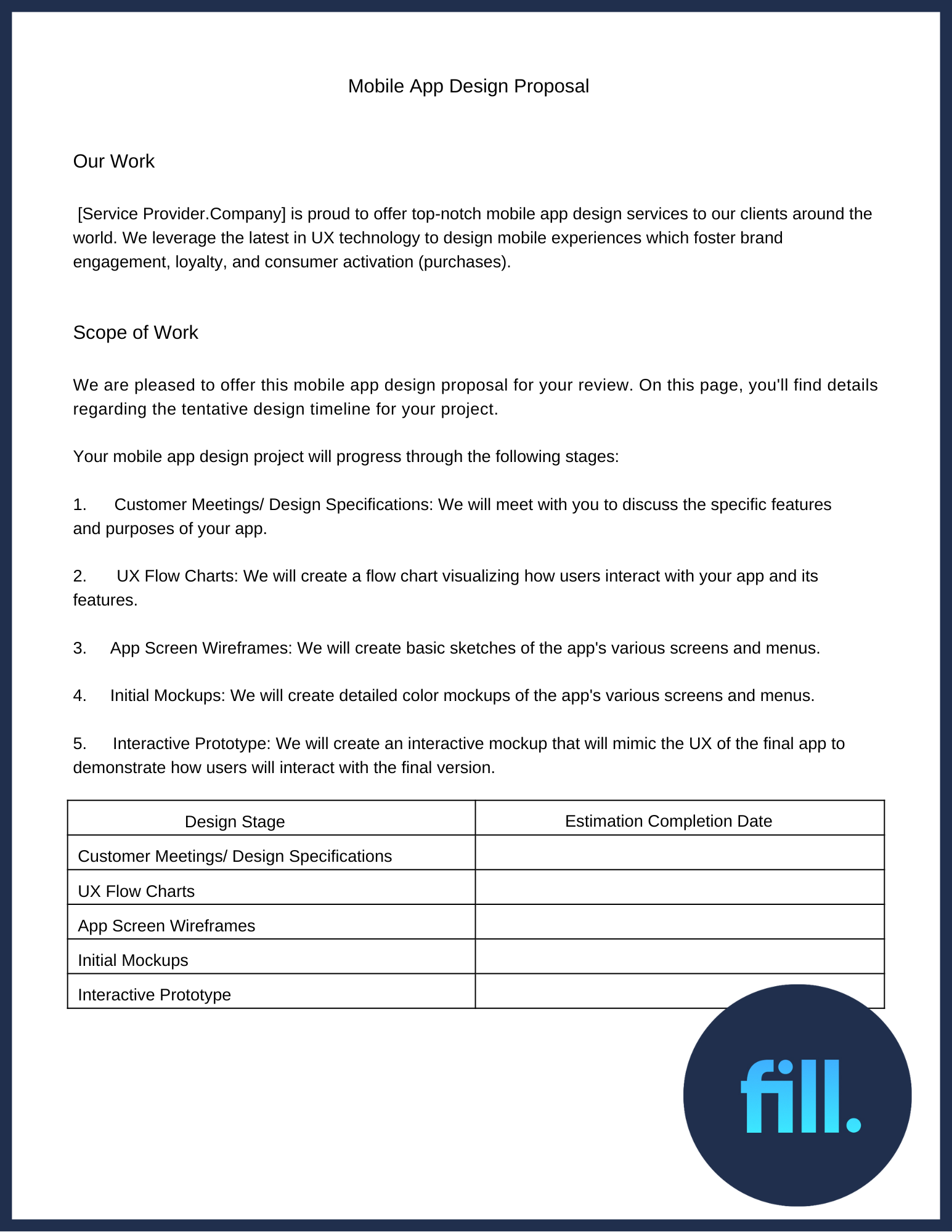 Learn how to write a mobile app design proposal that wins clients. Use templates, outline budgets, timelines, and showcase past work—all with Fill’s easy-to-use online proposal tools.