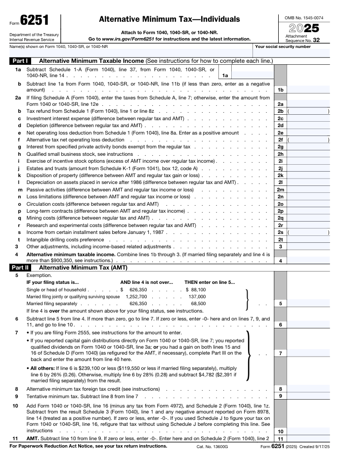 Form 6251, or the Alternative Minimum Tax (AMT) form, is a supplemental tax form taxpayers use to determine their alternative minimum tax liability. The Internal Revenue Service (IRS) typically requires this form from individuals with certain types of income or deductions subject to the AMT.