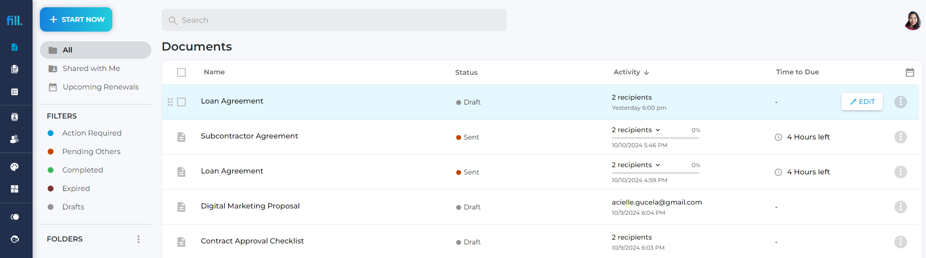 Explore Fill's intuitive dashboard and sign your first online document for free using a typed, handwritten, or uploaded signature. You can also send documents for signature, set signing orders, and receive real-time updates via email.