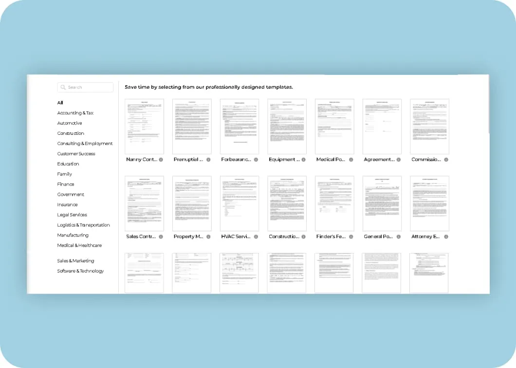 You never have to create anything from scratch. You can get your documents ready in seconds with pre-made and saved templates for almost any use-case/industry.