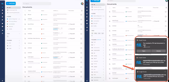 Keep a close eye on all your document-related tasks by enabling push notifications. You will receive alerts on all activities pertaining to your paperwork–when you receive new documents to sign, your signer has completed signing the paperwork, or when they view the files that were sent to them for signing. Moreover, with Fill’s prompt bar updates, you can easily get updated on new releases so you can check out new features and enhancements.