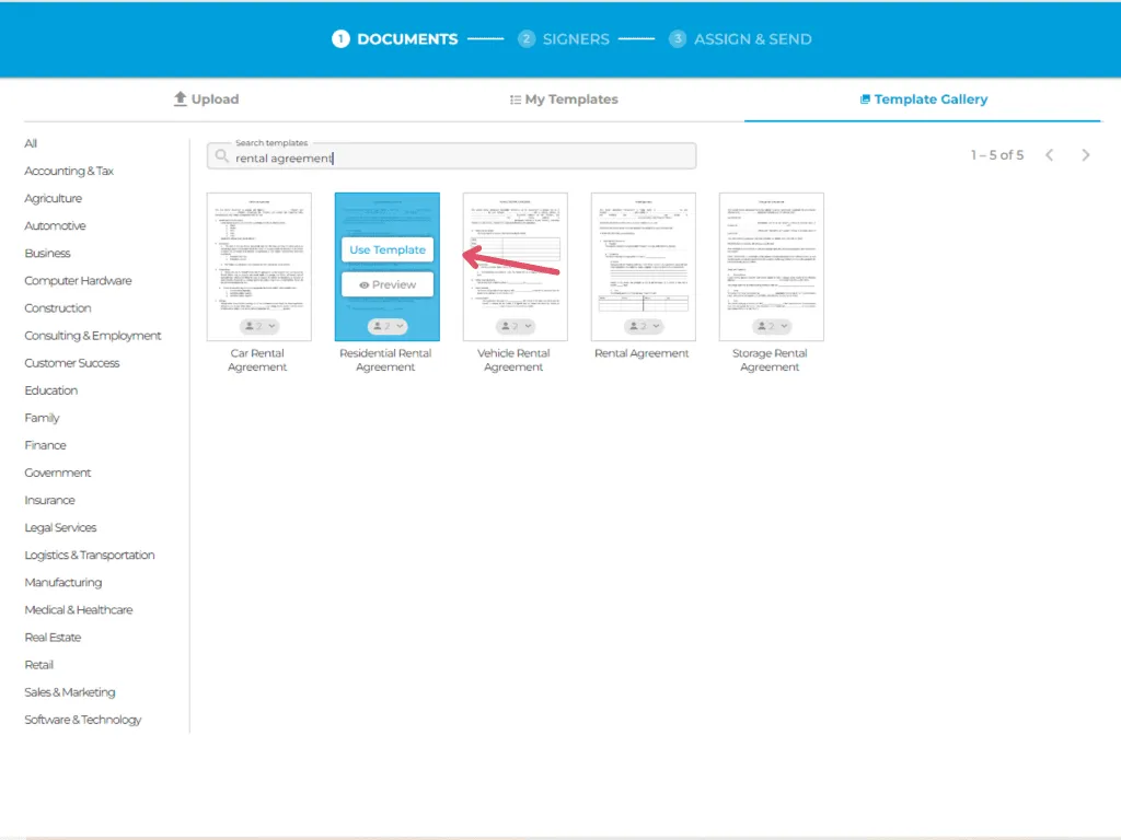 4. Instead of uploading the document, click the tab that says Template Gallery, then search for "rental agreement."