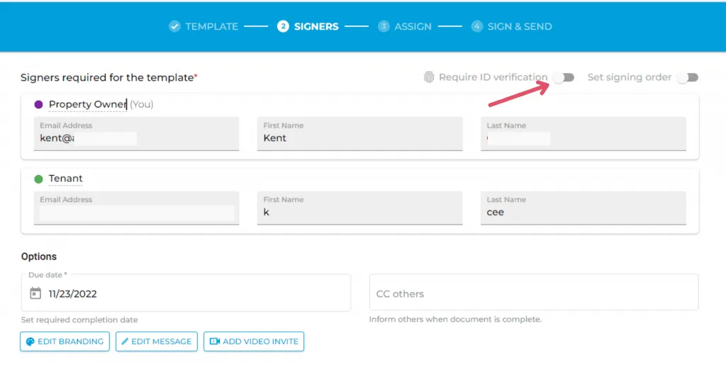 6. Fill out the required details and set a due date for signing. You can also require ID verification for your tenant.